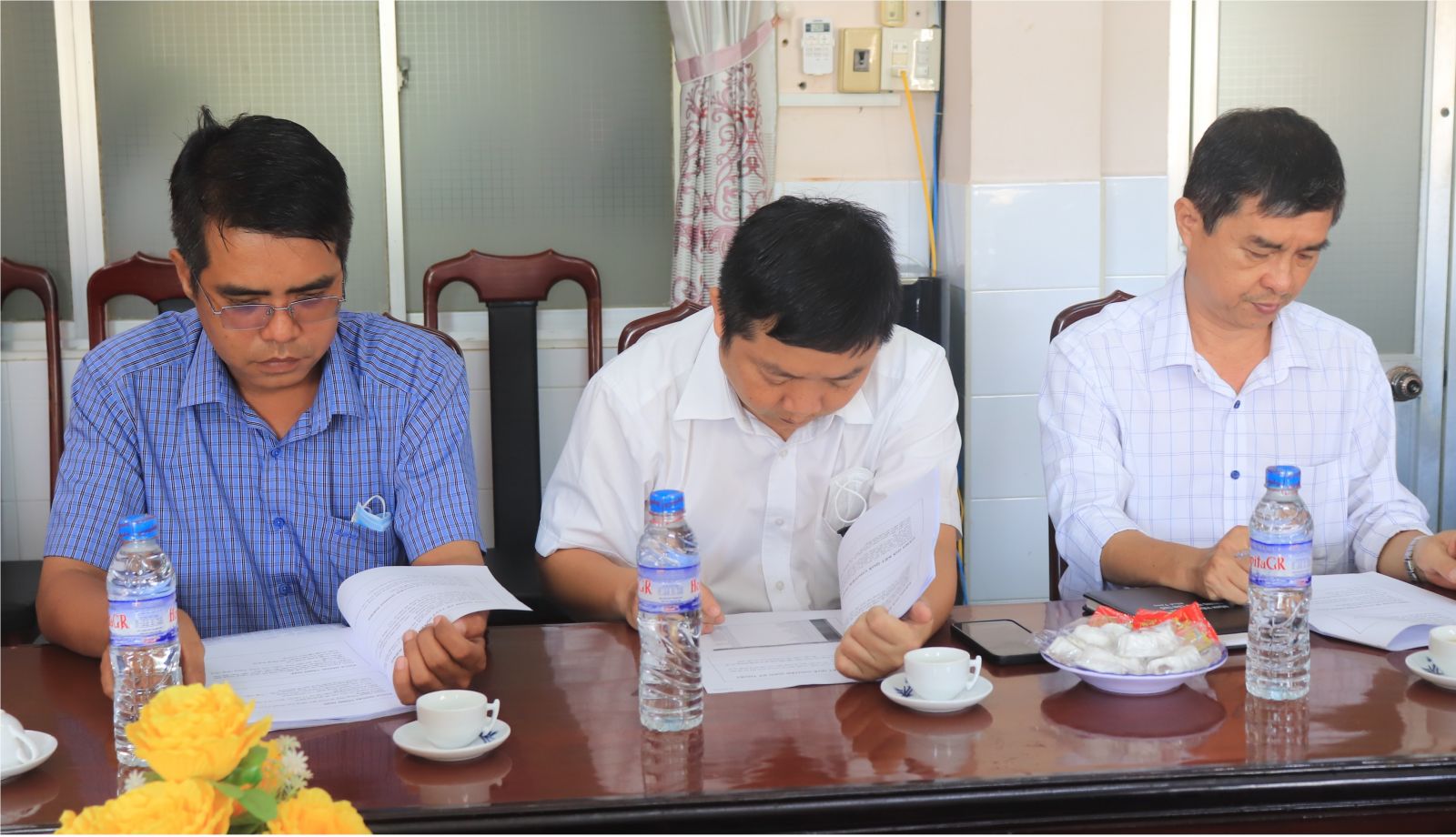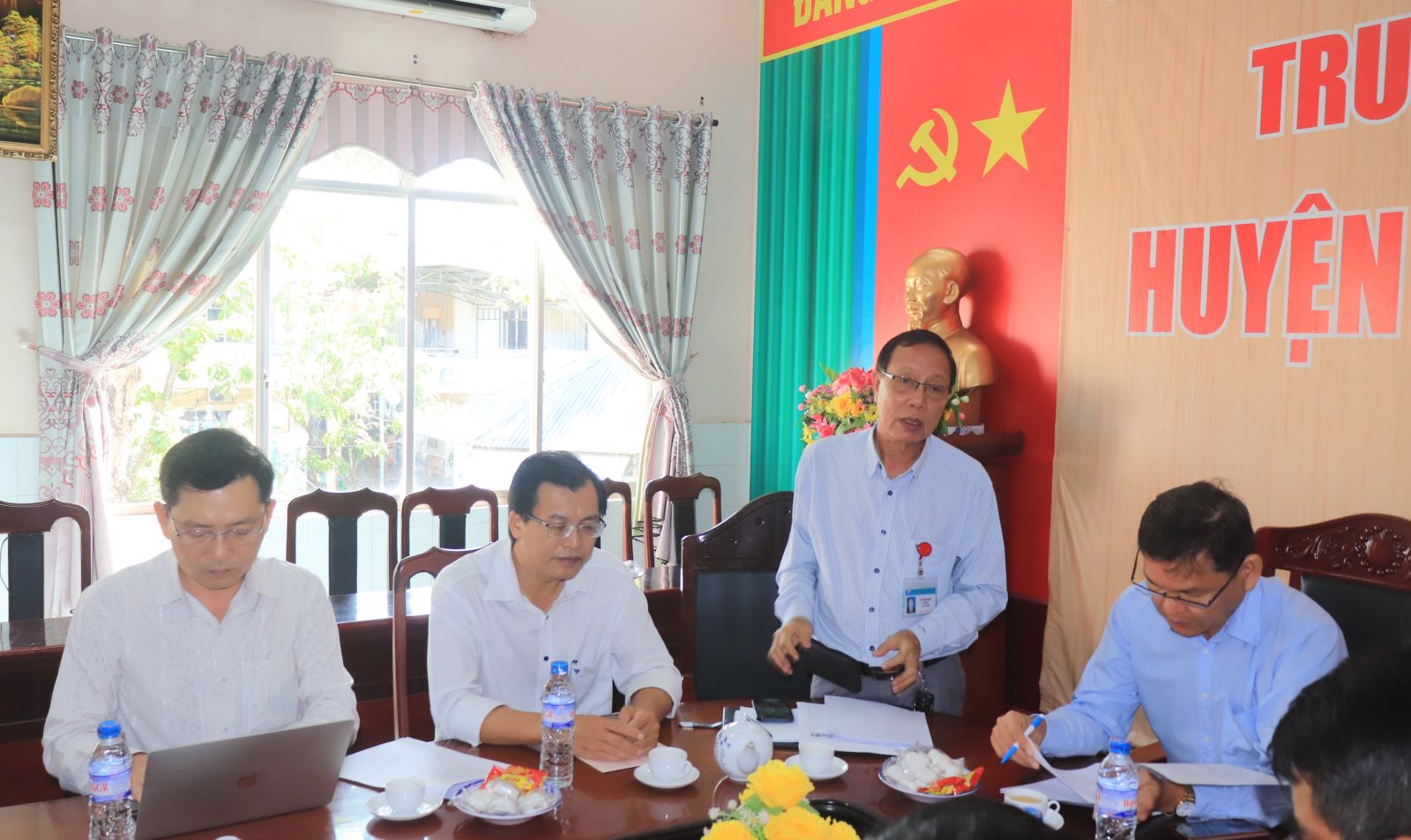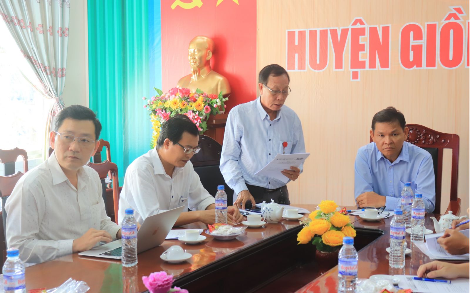 (Từ bên phải qua: Bs. Nguyễn Trúc Giang (P.Giám đốc SYT ; Bs. Lê Văn Nhì (Giám Đốc TTYT GR; Bs. Hà Quốc Việt (P. Giám đốc TTYT GR) ; Ths.Bs. Nguyễn Thành Nam (Trưởng phòng nghiệp vụ Y – Dược SYT).
