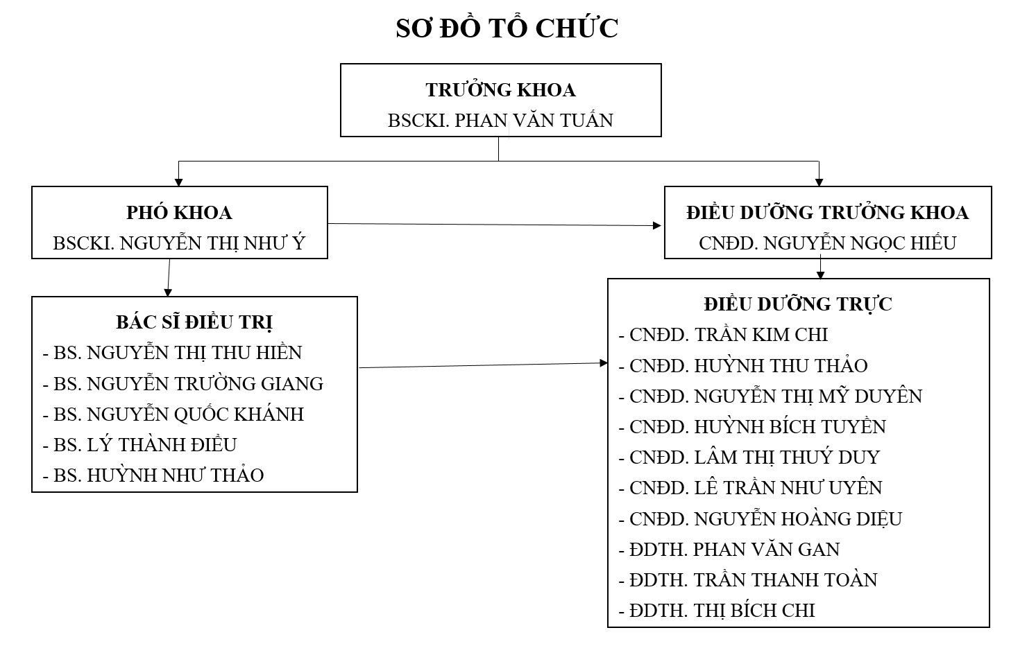 * Nhiệm vụ: -Tham mưu Ban Giám đốc các kế hoạch, phương án về các vấn đề liên quan đến chăm sóc, điều trị bệnh nhân nội trú tại khoa.