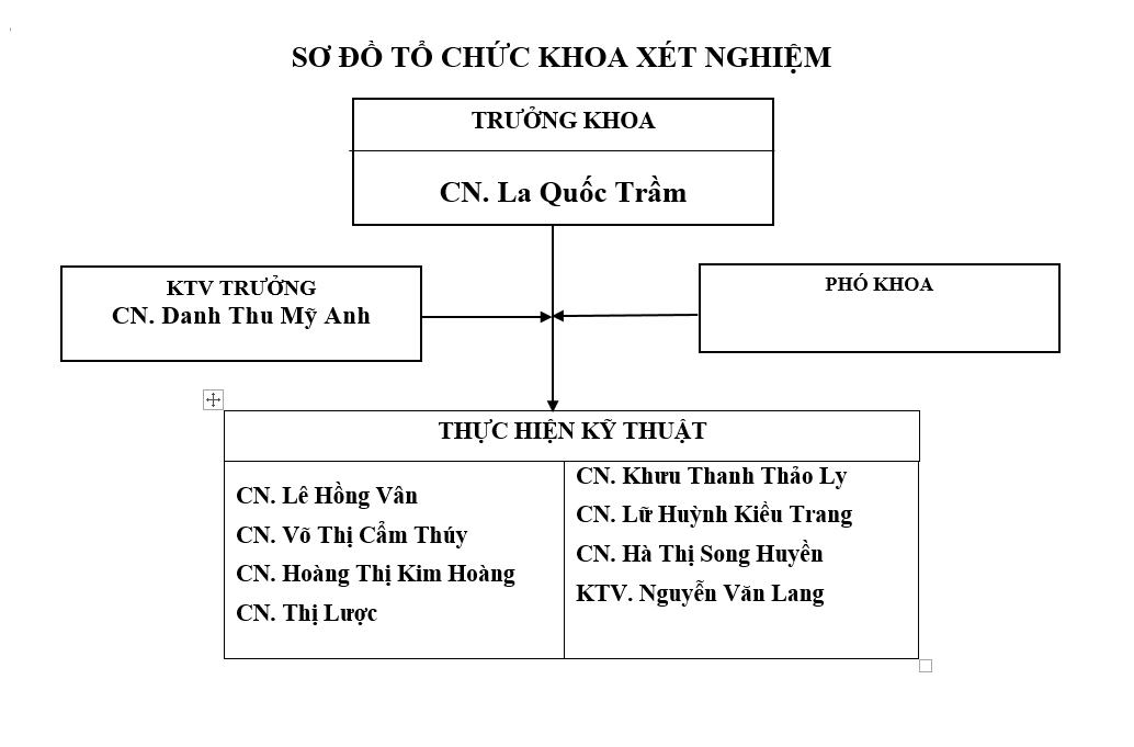 * Nhiệm vụ: Thực hiện các kỹ thuật xét nghiệm phục vụ bệnh nhân đến khám bệnh và bệnh nhân điều trị bệnh; Tổ chức hoạt động của khoa theo đúng quy chế của Bộ Y tế và đảm bảo an toàn cho các thành viên trong khoa và môi trường xung quanh; Thực hiện đúng các quy chế về quản lý và sử dụng hóa chất, thuốc thử; Đảm bảo công tác trật tự, vệ sinh và vô khuẩn trong thực hiện các kỹ thuật; Quản lý và sử dụng thiết bị máy móc trong khoa theo đúng quy chế quản lý và sử dụng vật tư, thiết bị y tế.